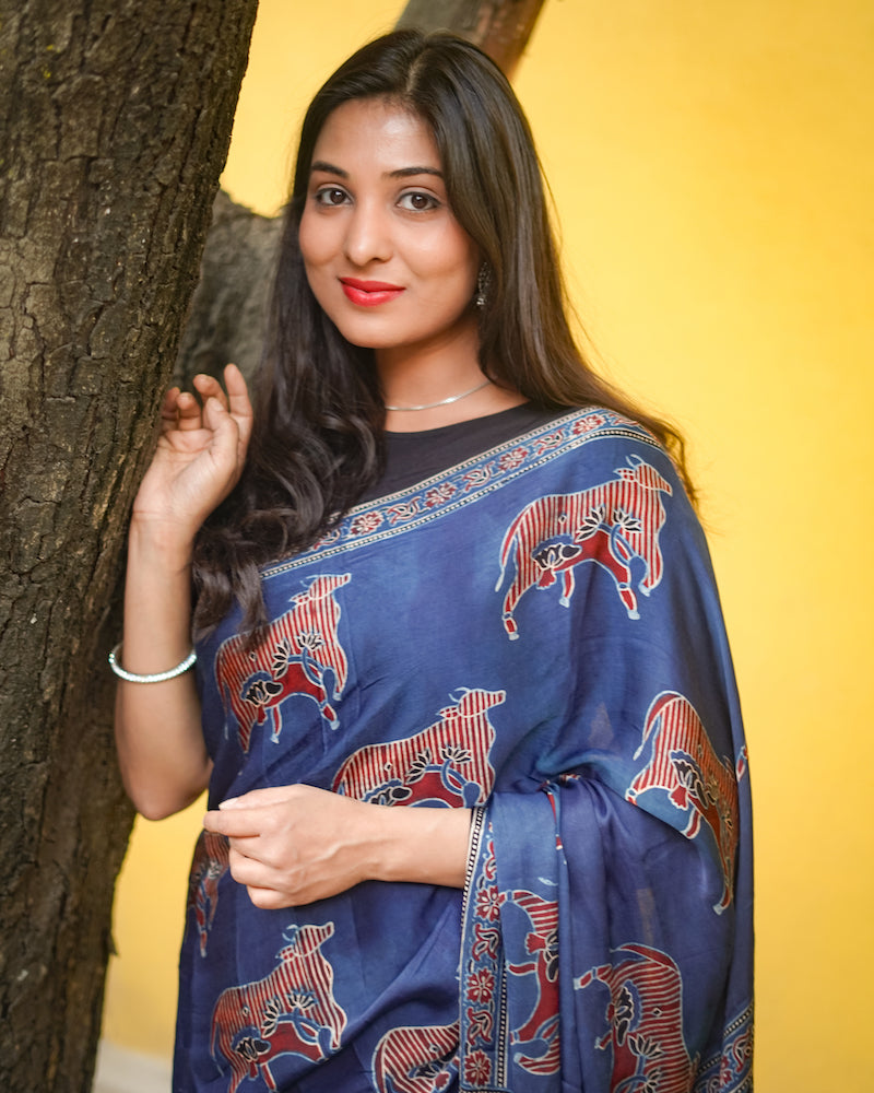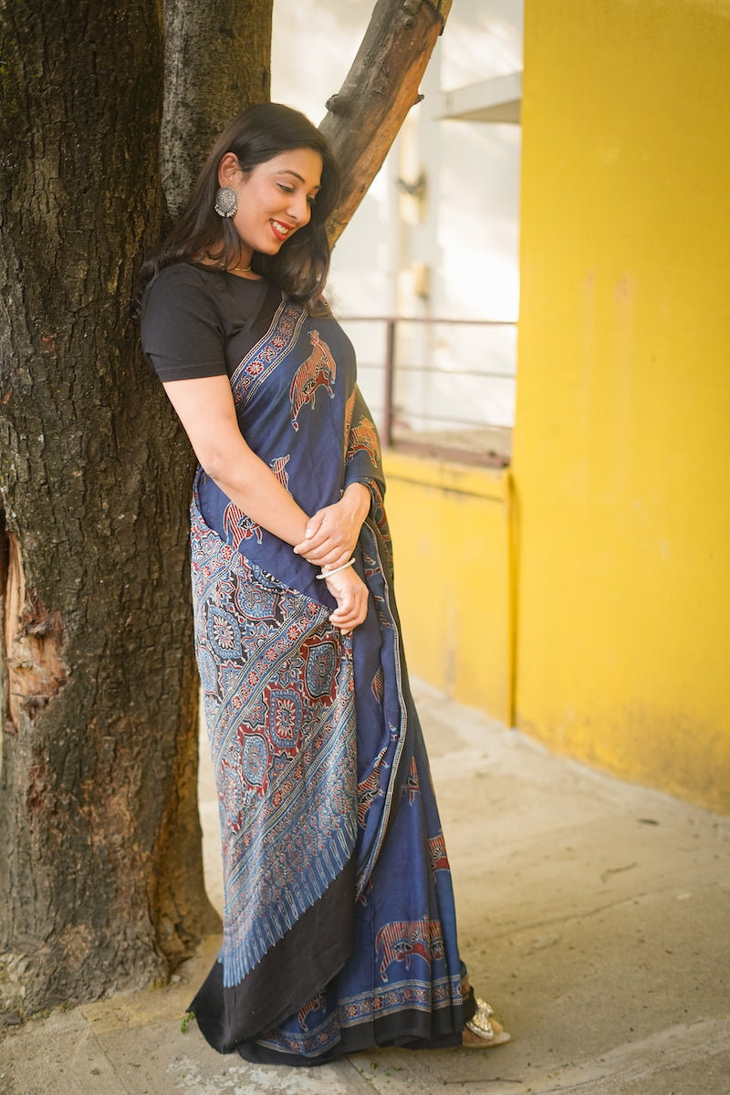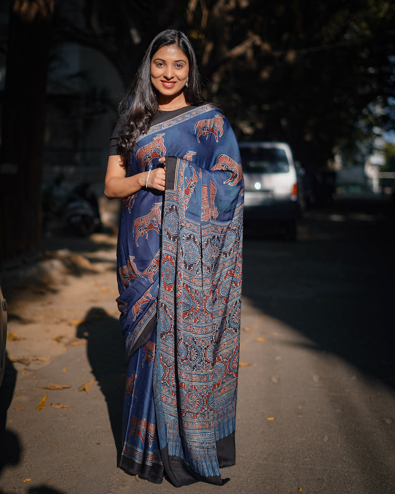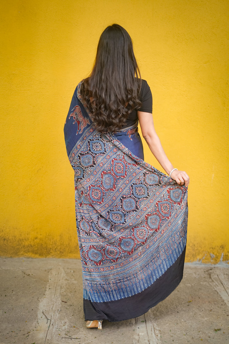Indigo Ajrakh Modal Silk Saree