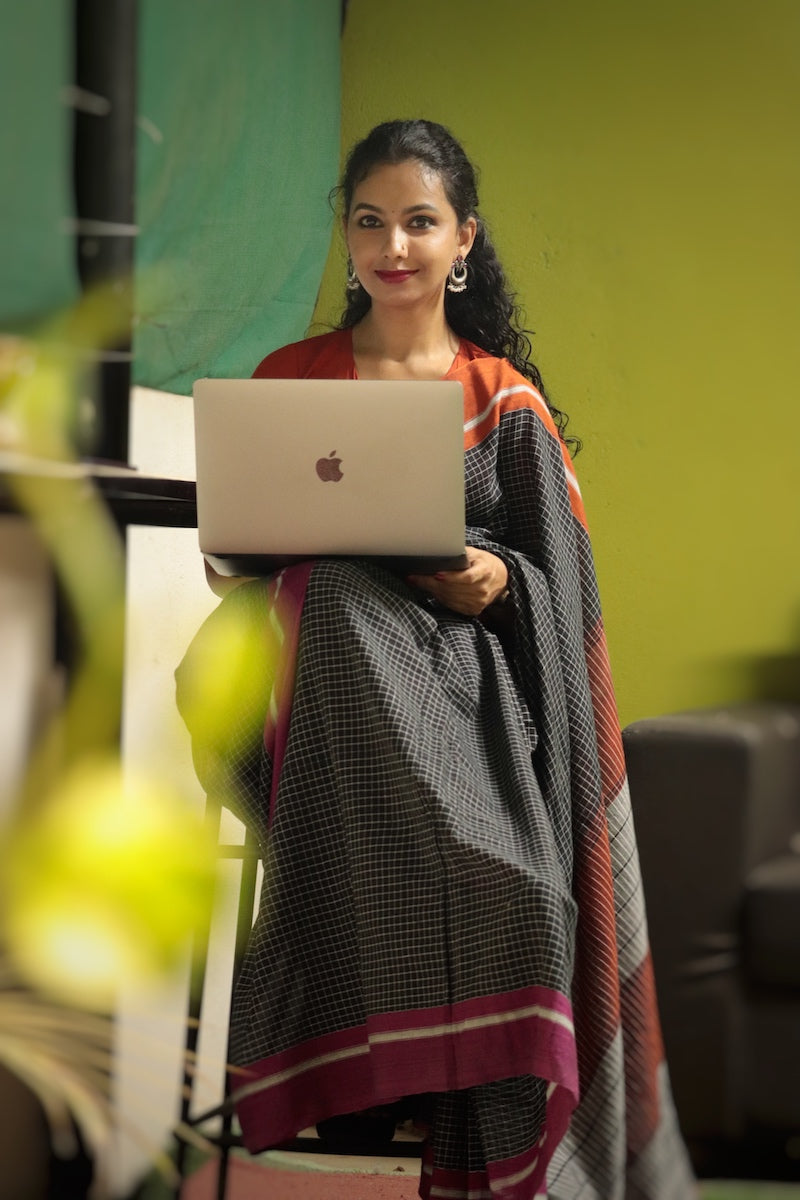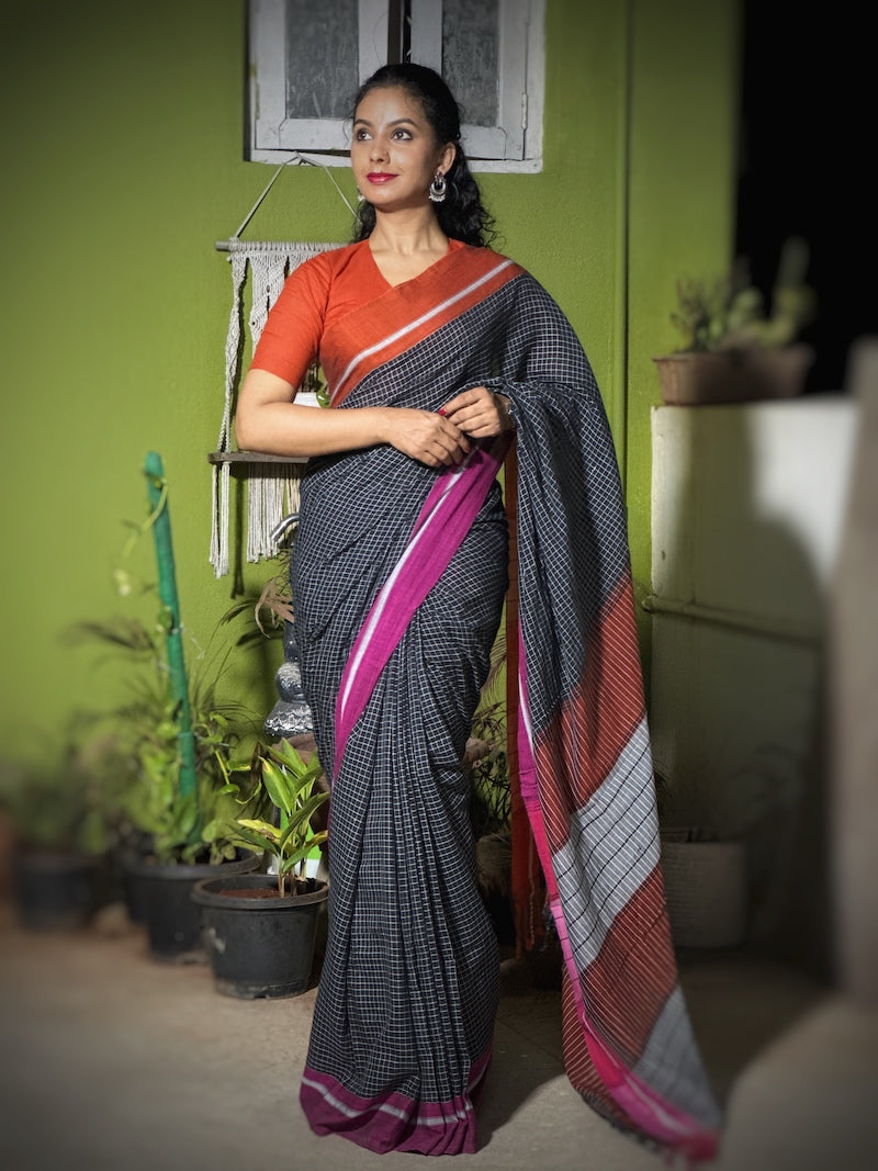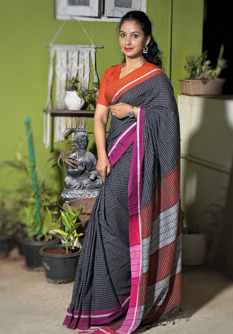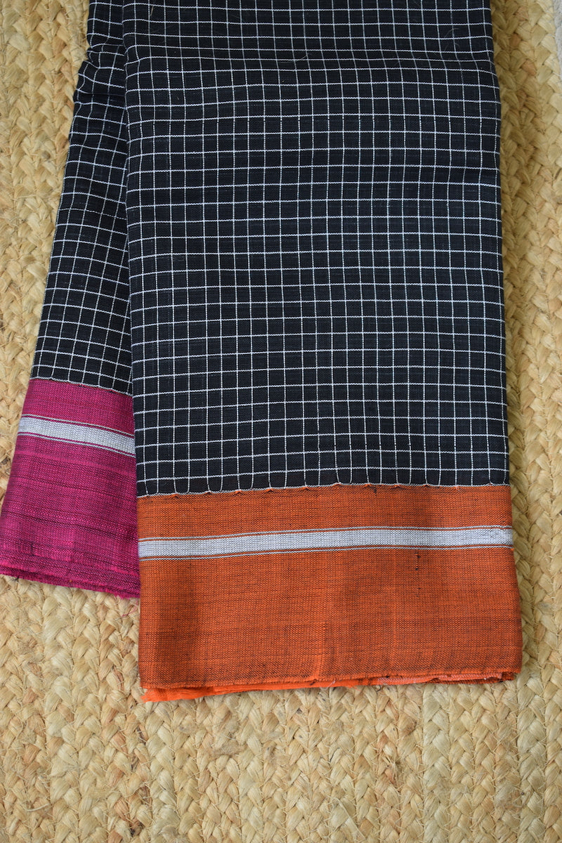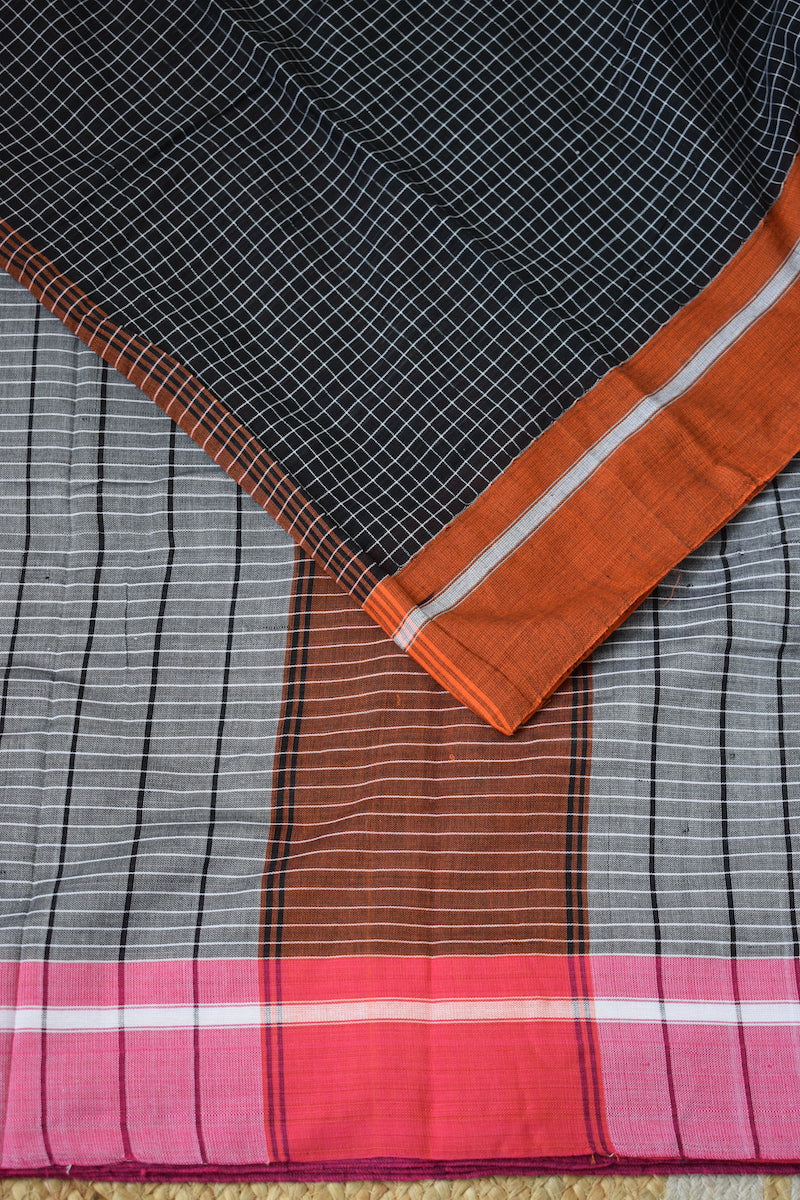 Black Pattada Anchu Cotton Saree with Pink & Orange border