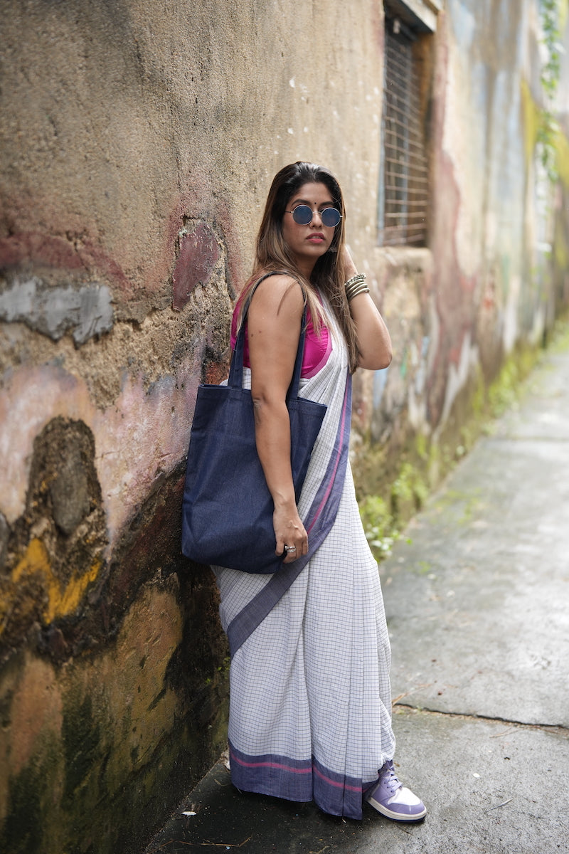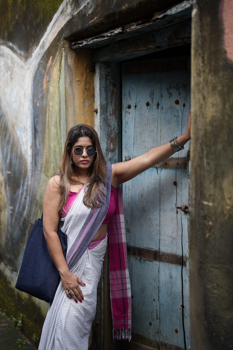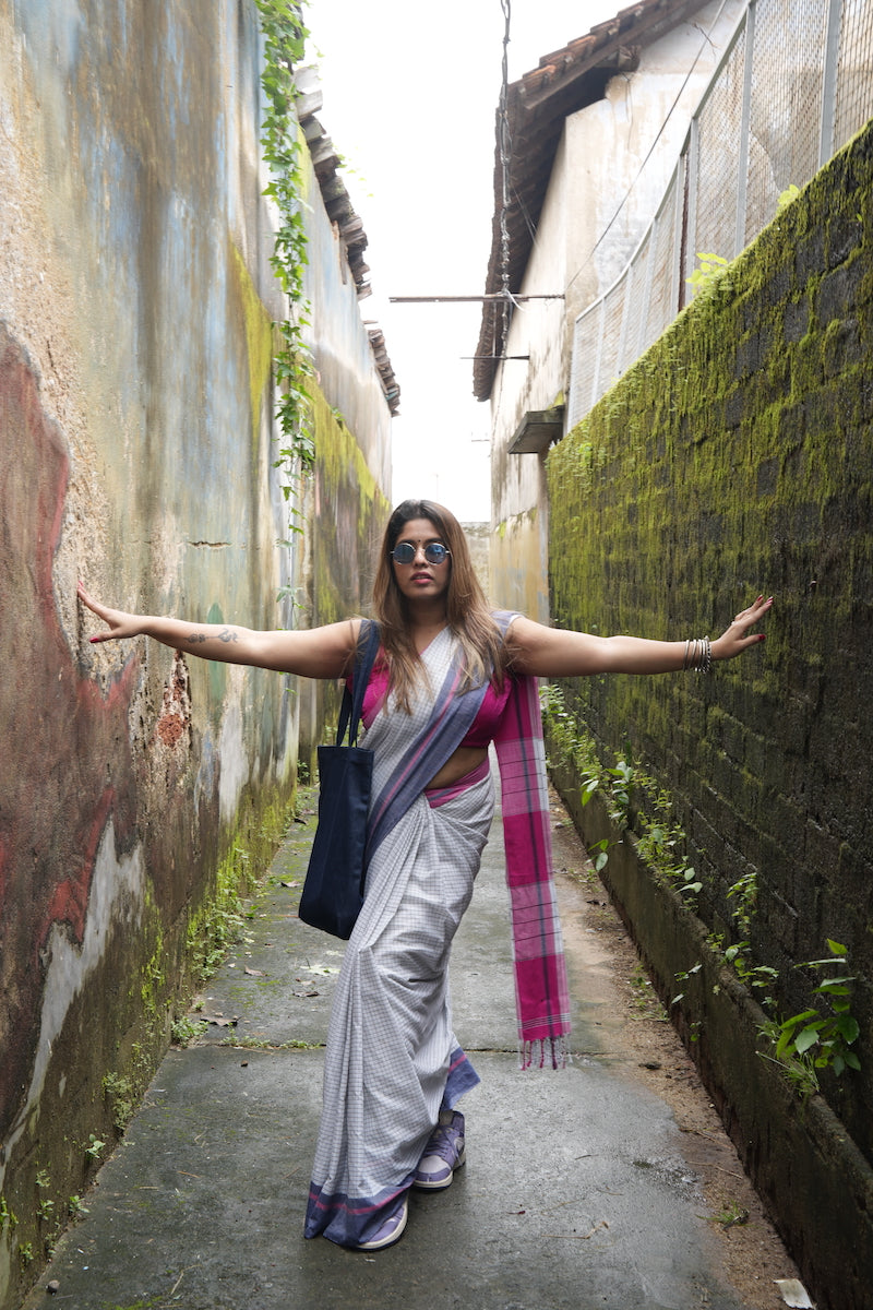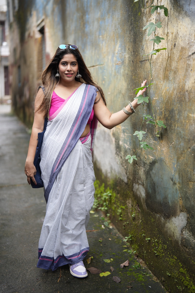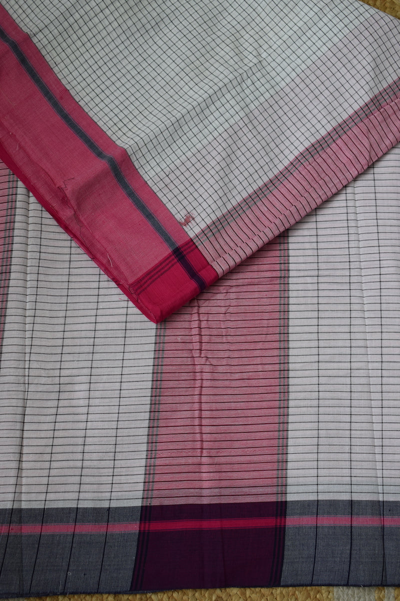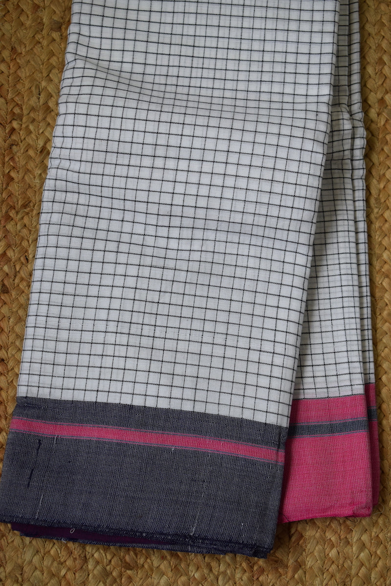 White Pattada Anchu Cotton Saree with Pink & Blue border