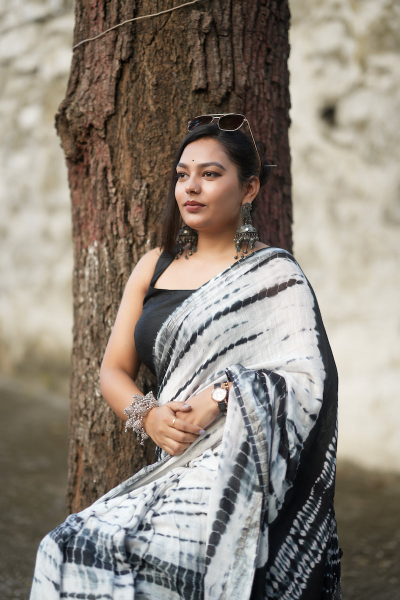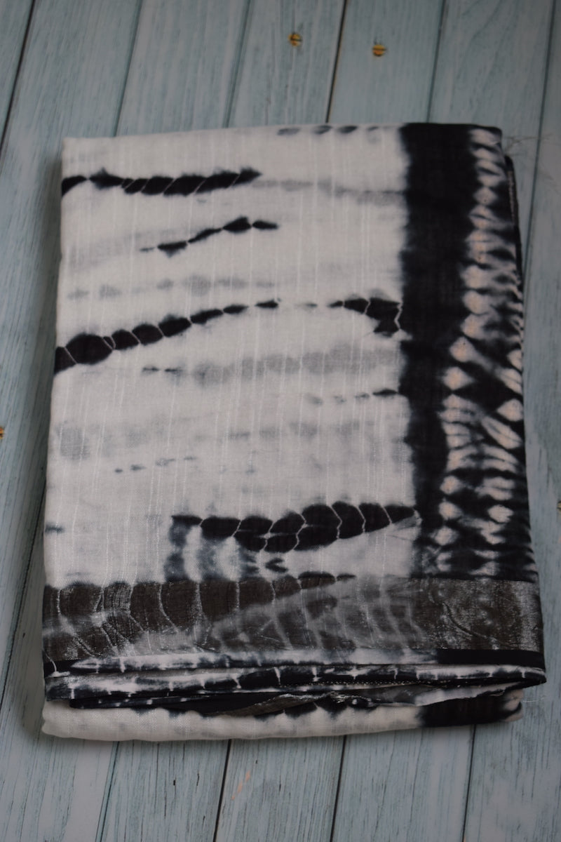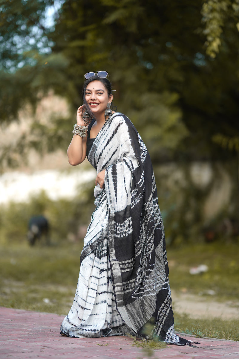White Printed Linen Cotton Saree