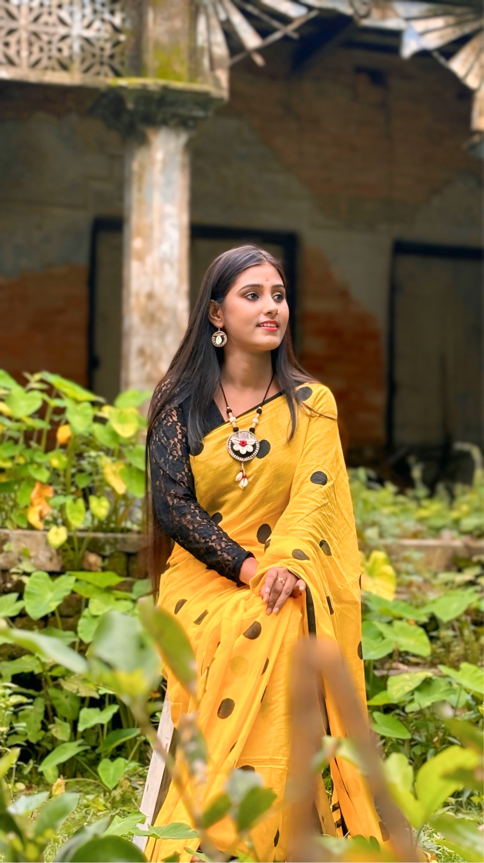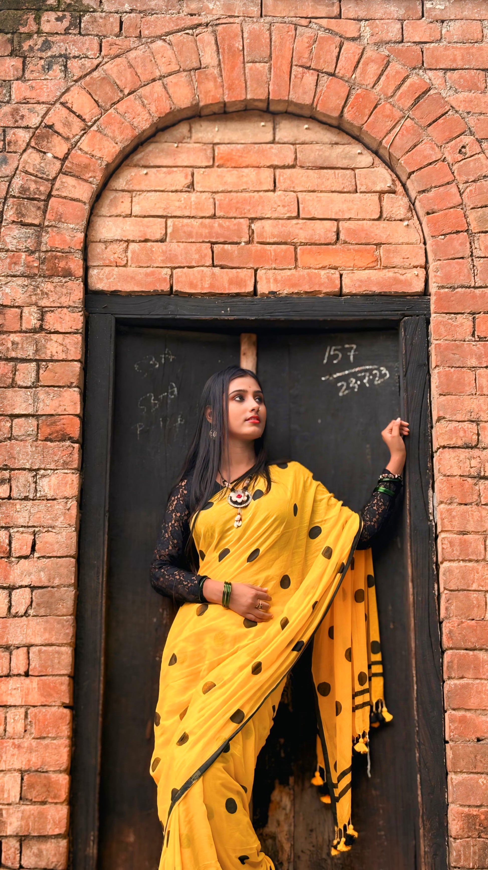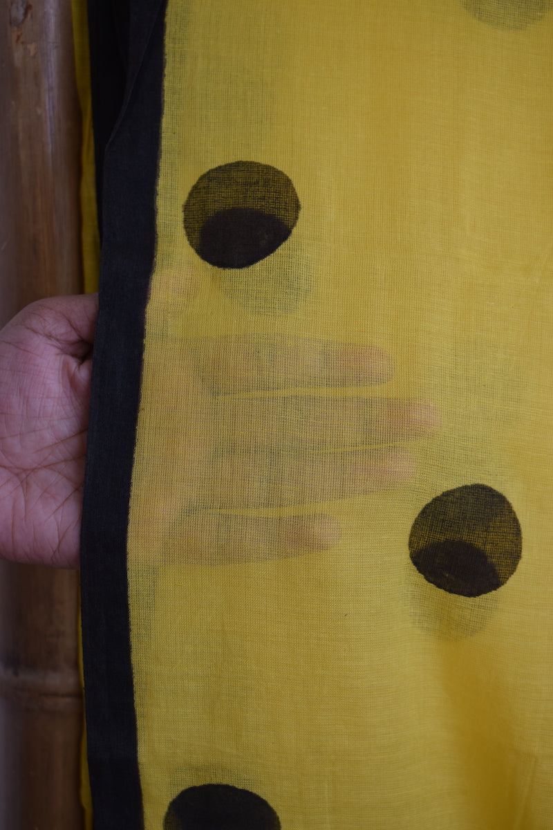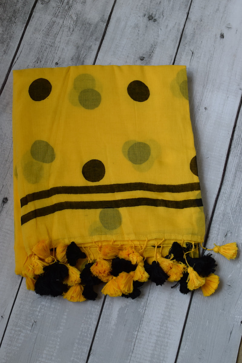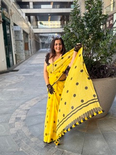 Yellow Polka Dots Mul Cotton Saree with tassels