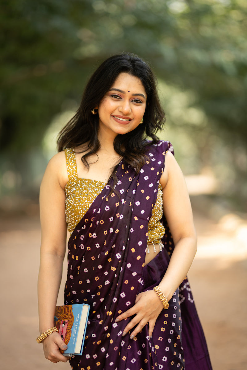 A lustrous modal silk saree with dana (dot) Bandhani / Bandhej adds oomph to your style. The lagdi patta on its pallu enhances its look!!