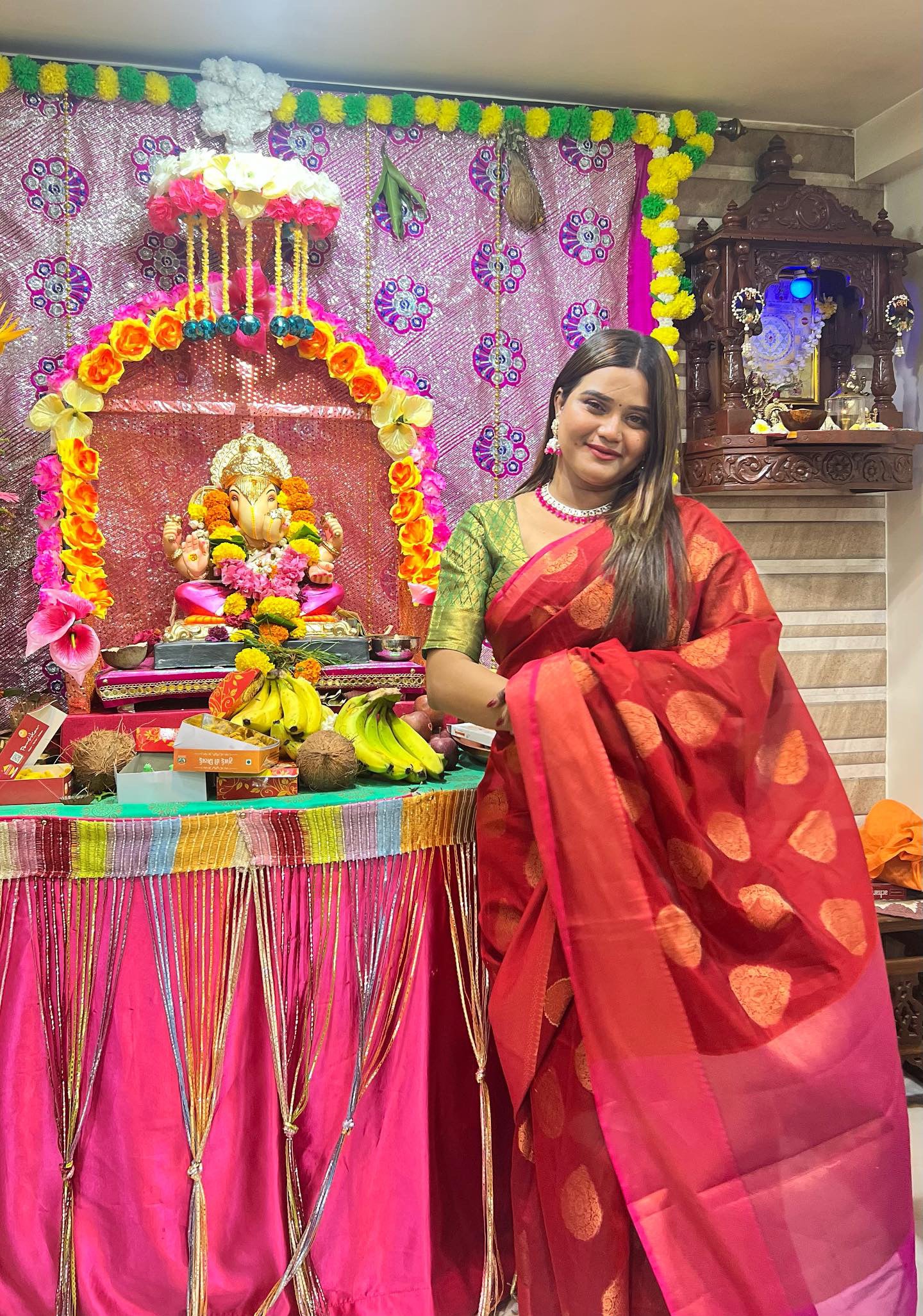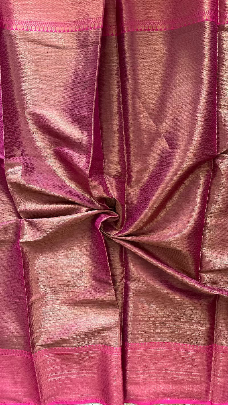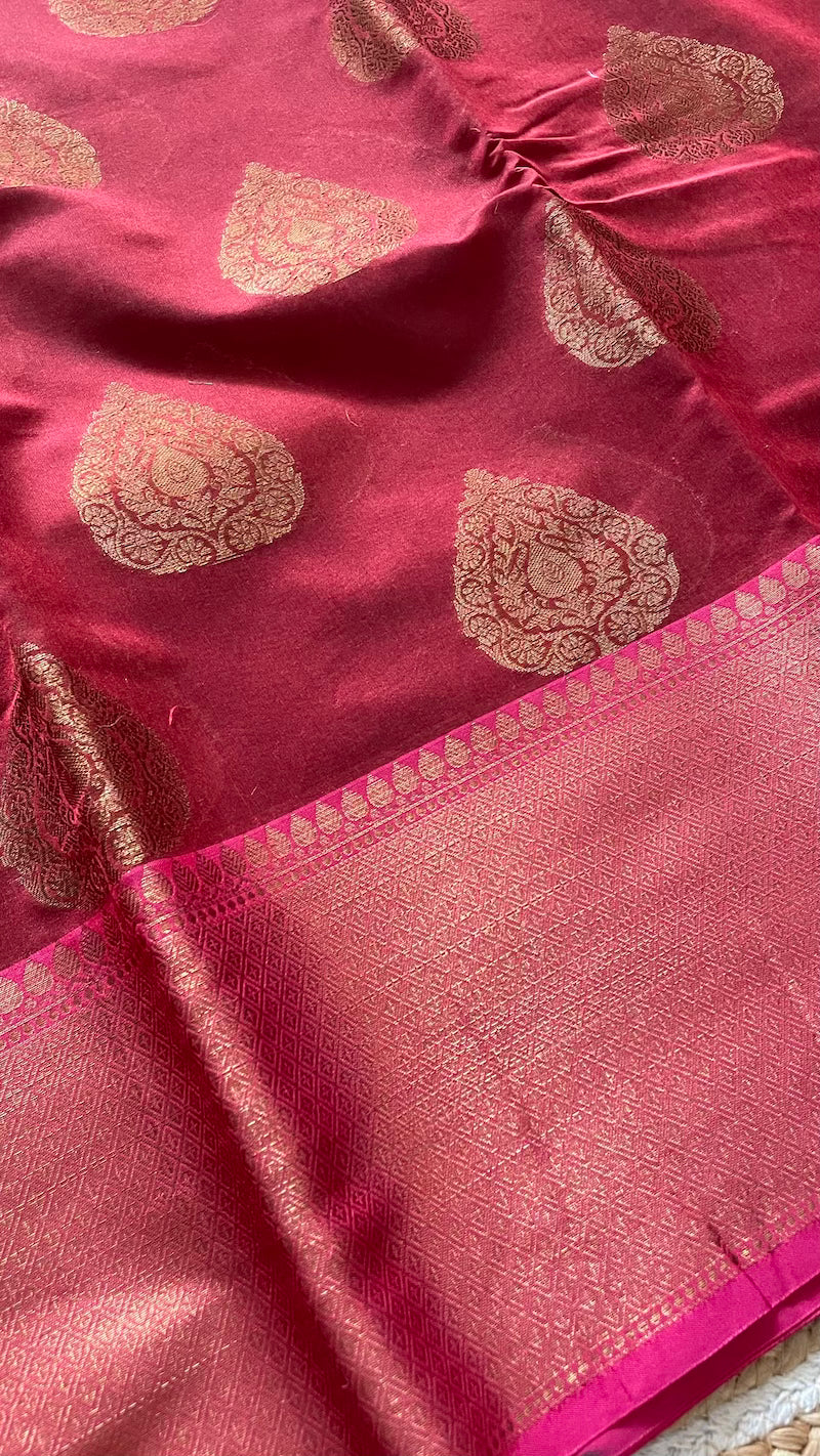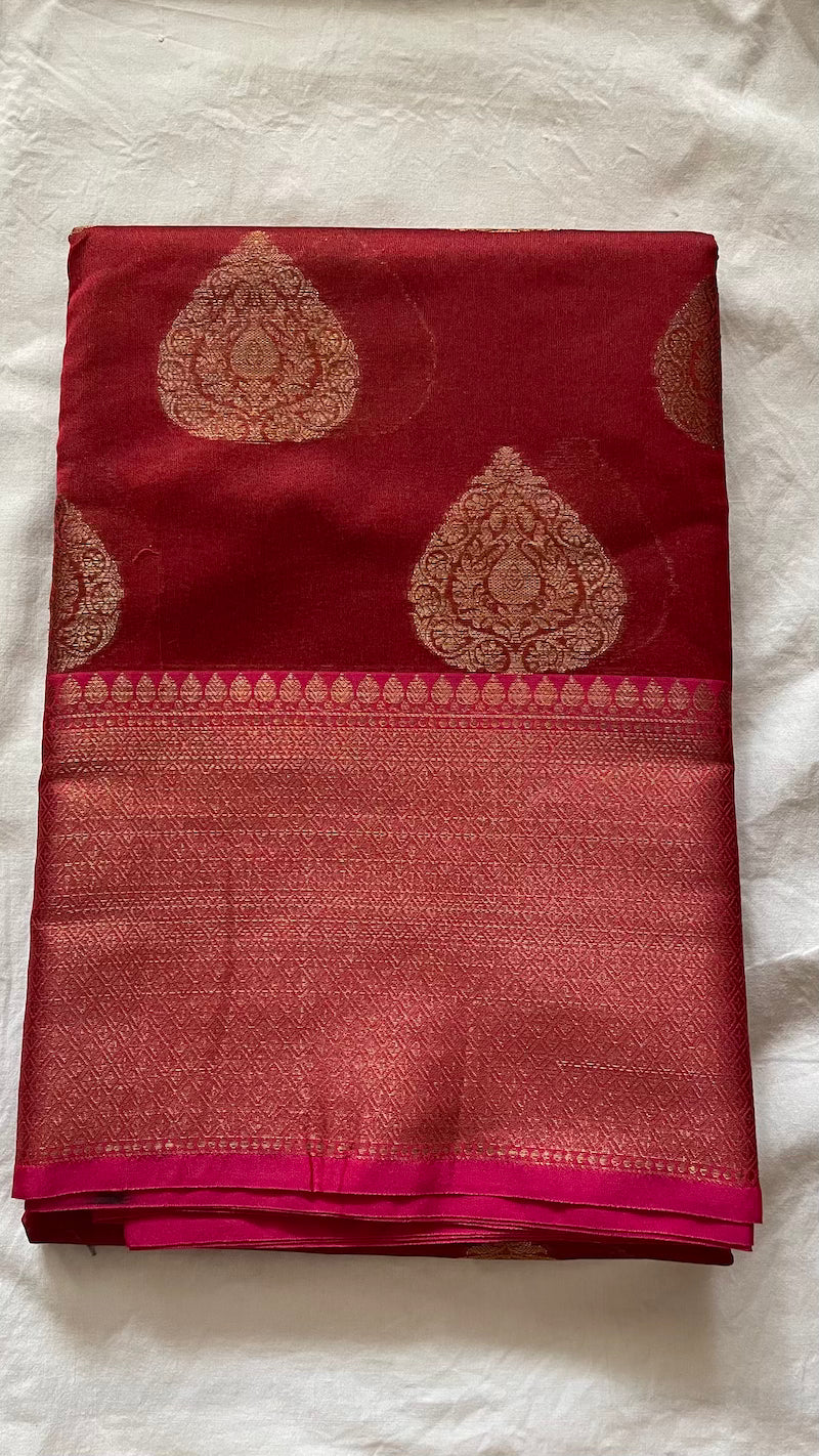 A gorgeous Red Kora Silk Saree has grand Pink borders and blouse piece with zari, with big buttas allover the body makes the saree look absolutely stunning.