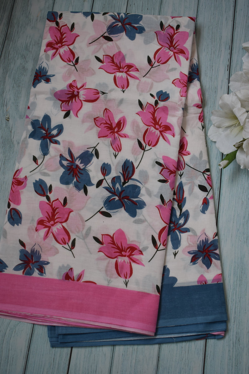 White Printed Mul Cotton Saree