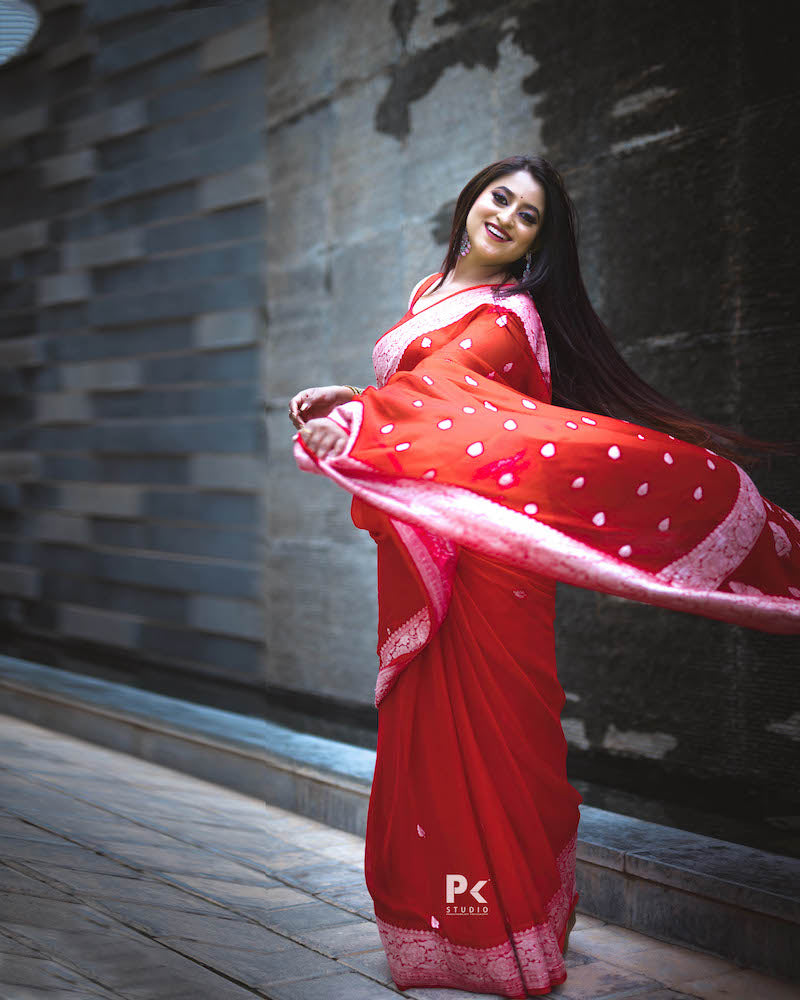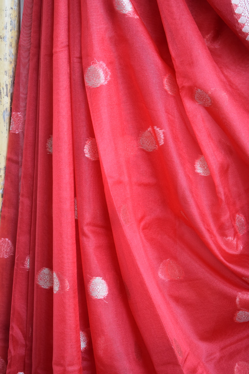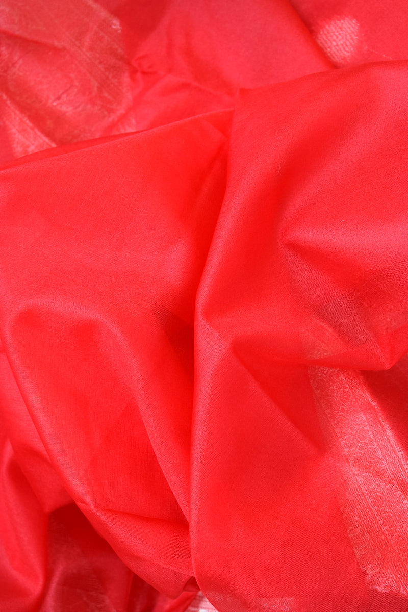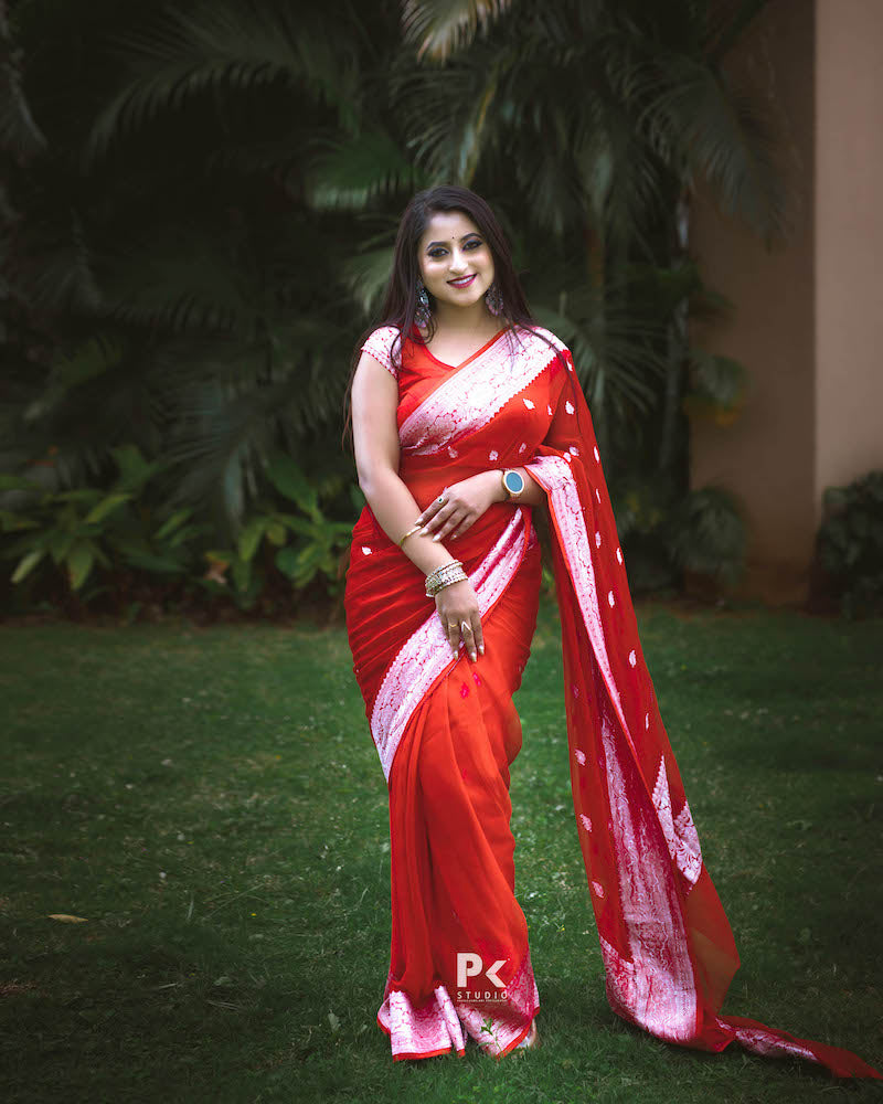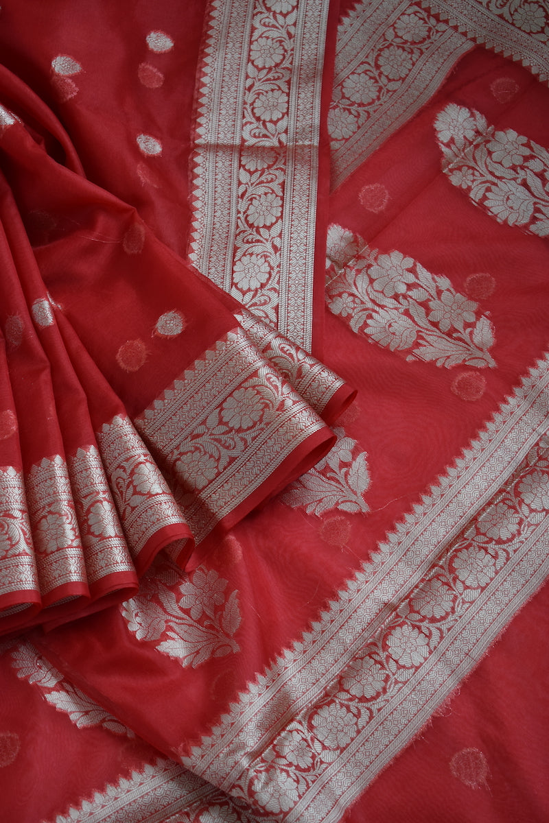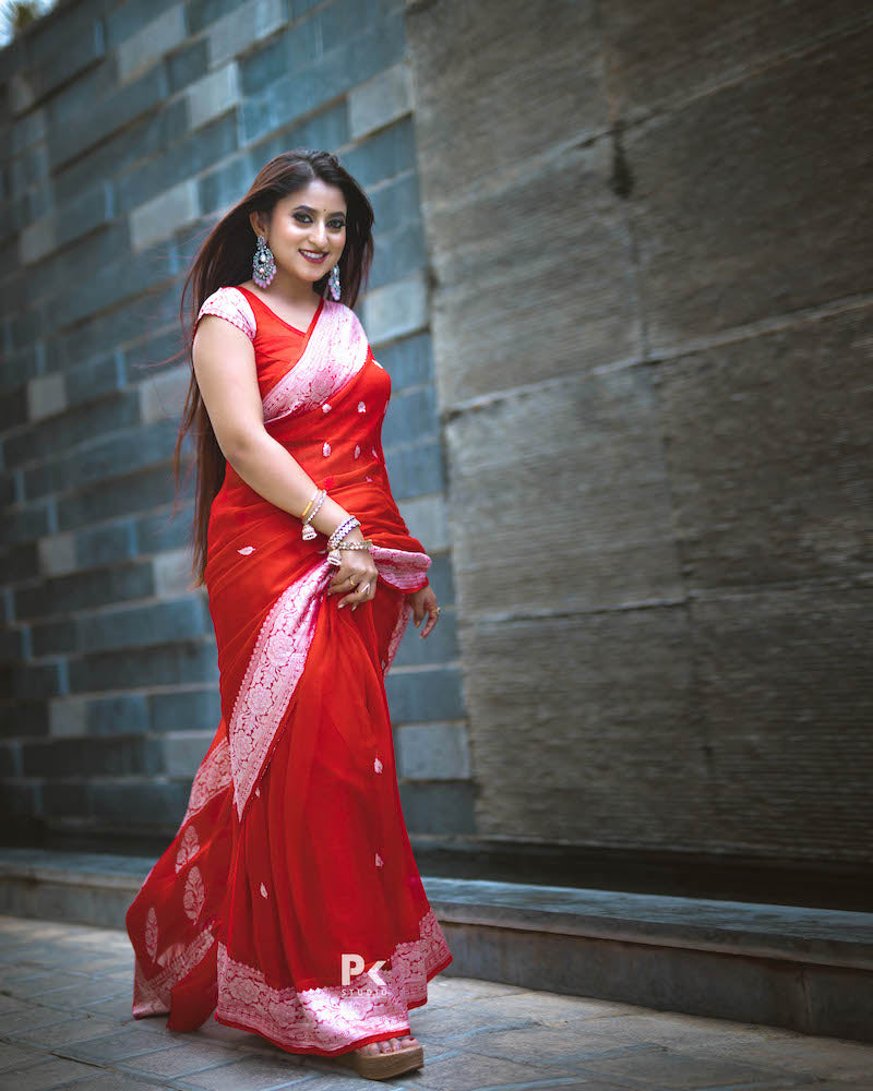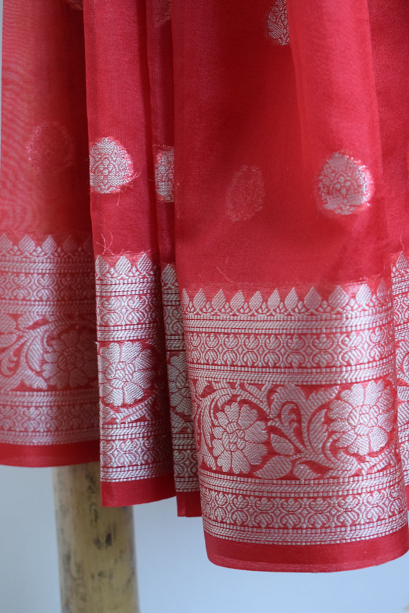 Bright Red Kora Organza Buti Benarasi Saree