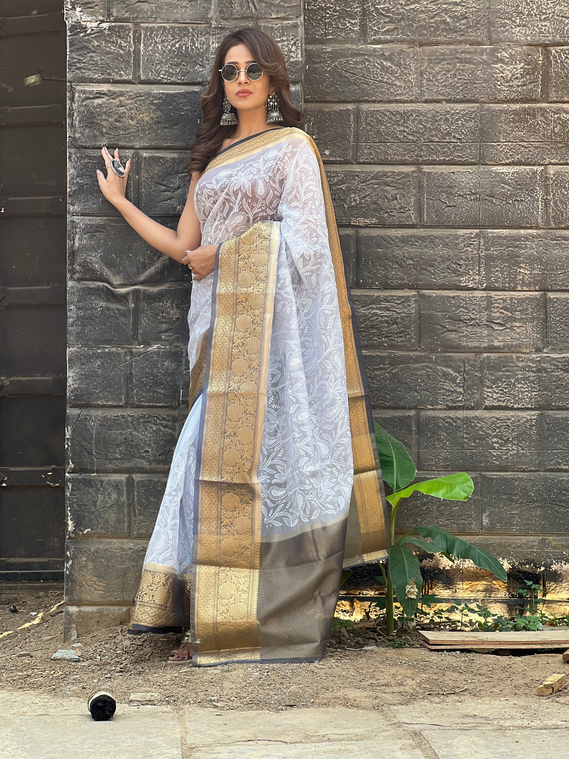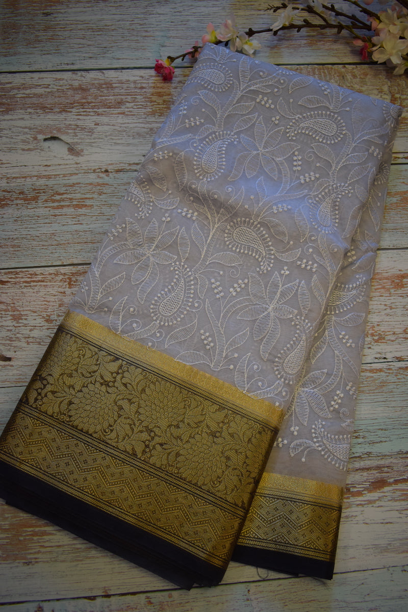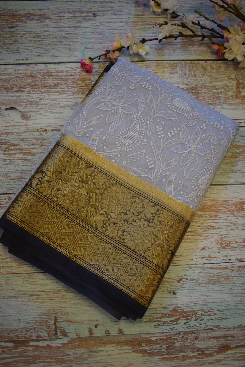 Grey Semi Organza Chikankari Benarasi Saree
