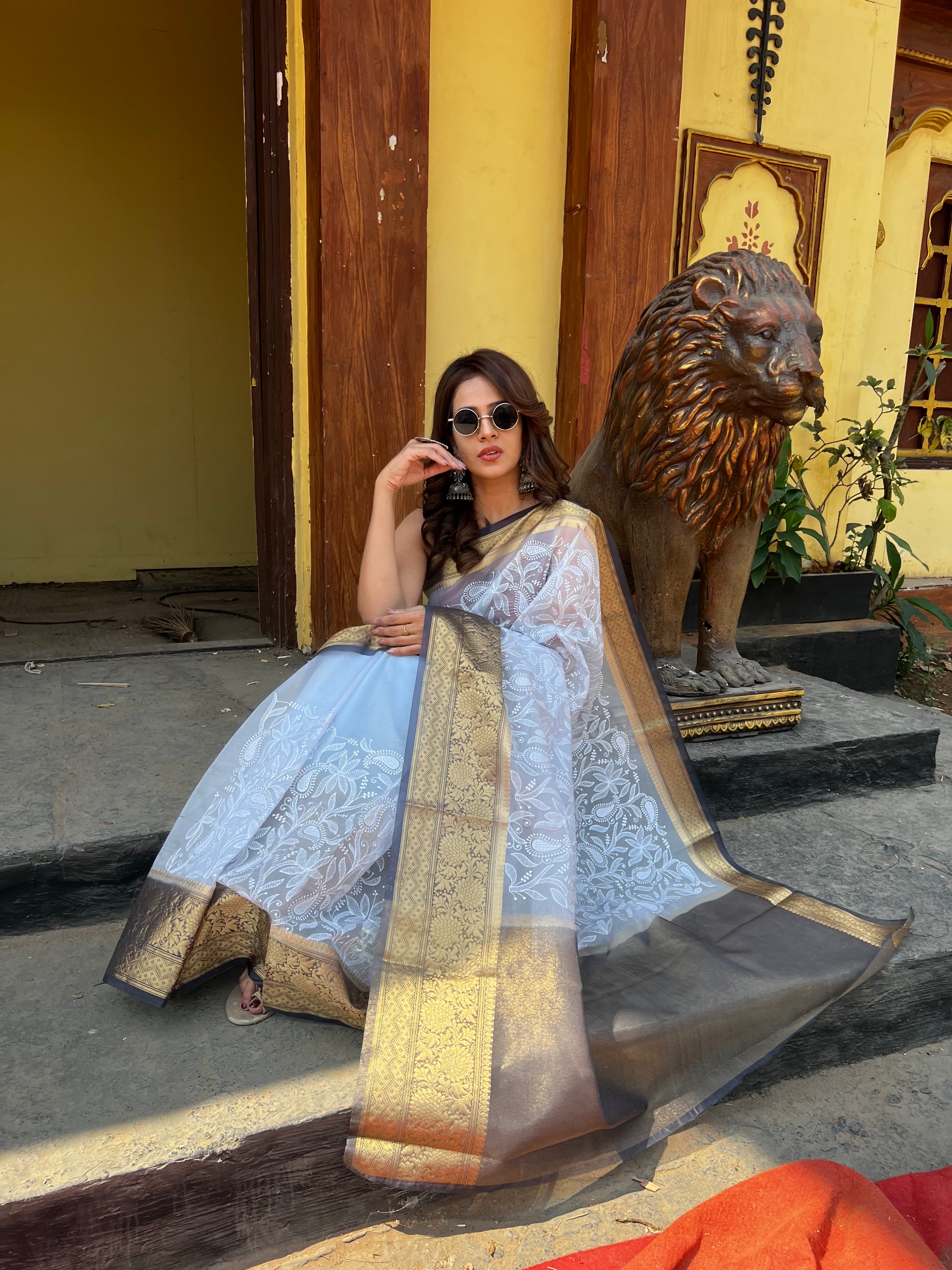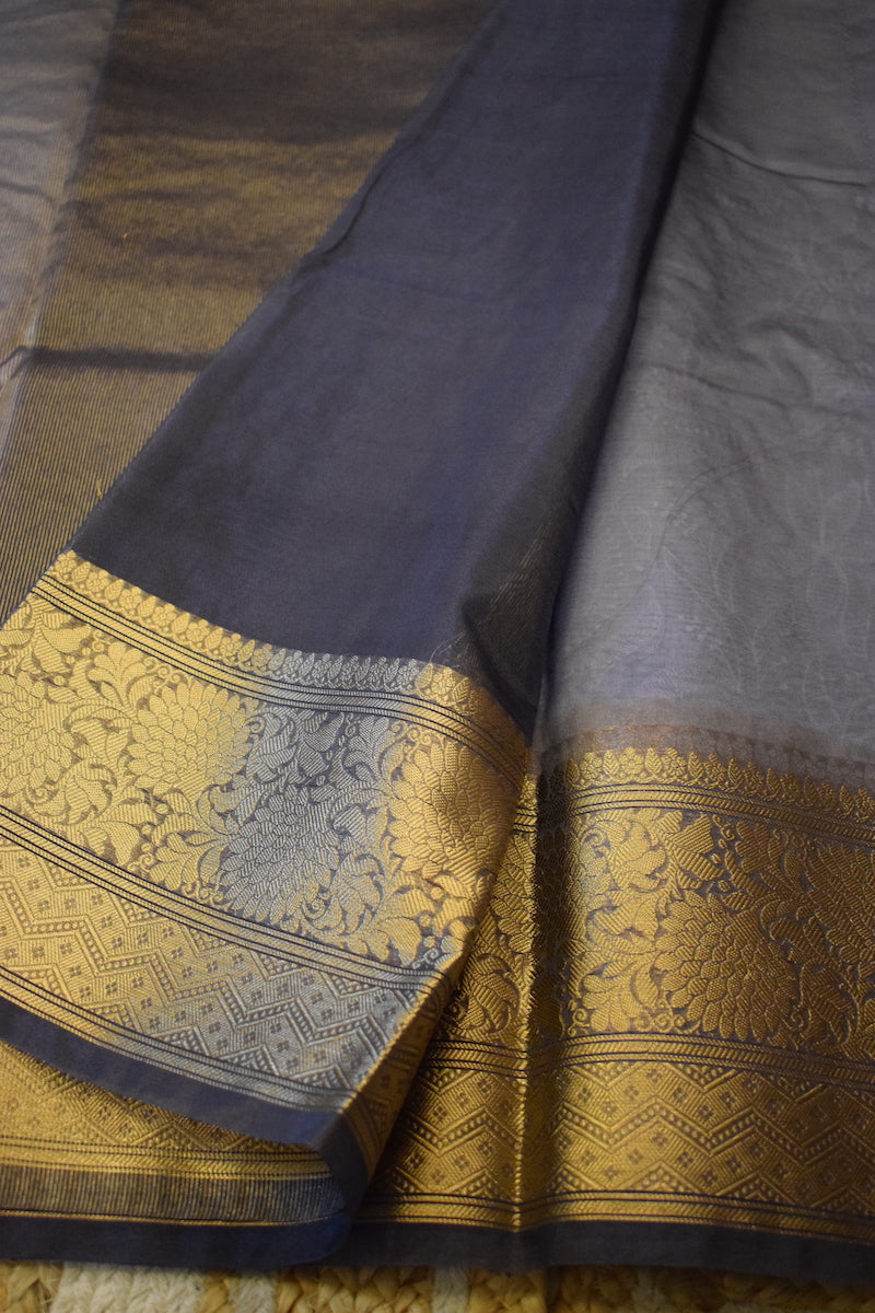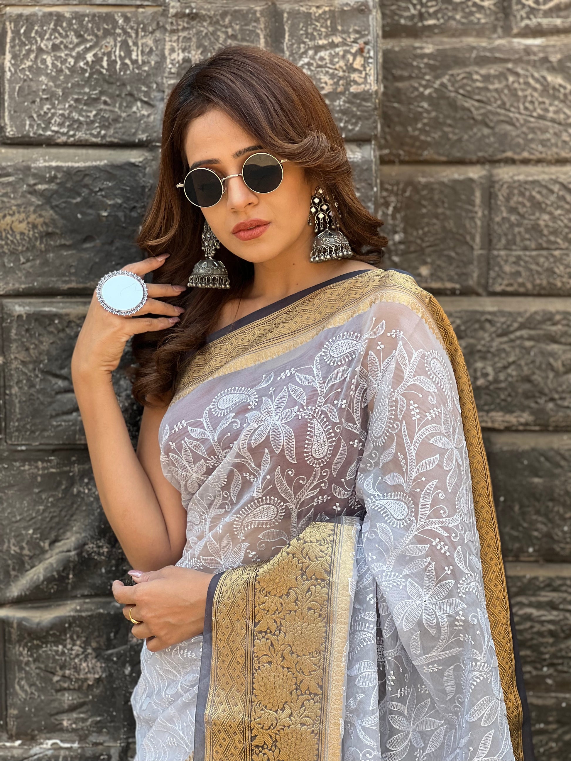 Grey Semi Organza Chikankari Benarasi Saree