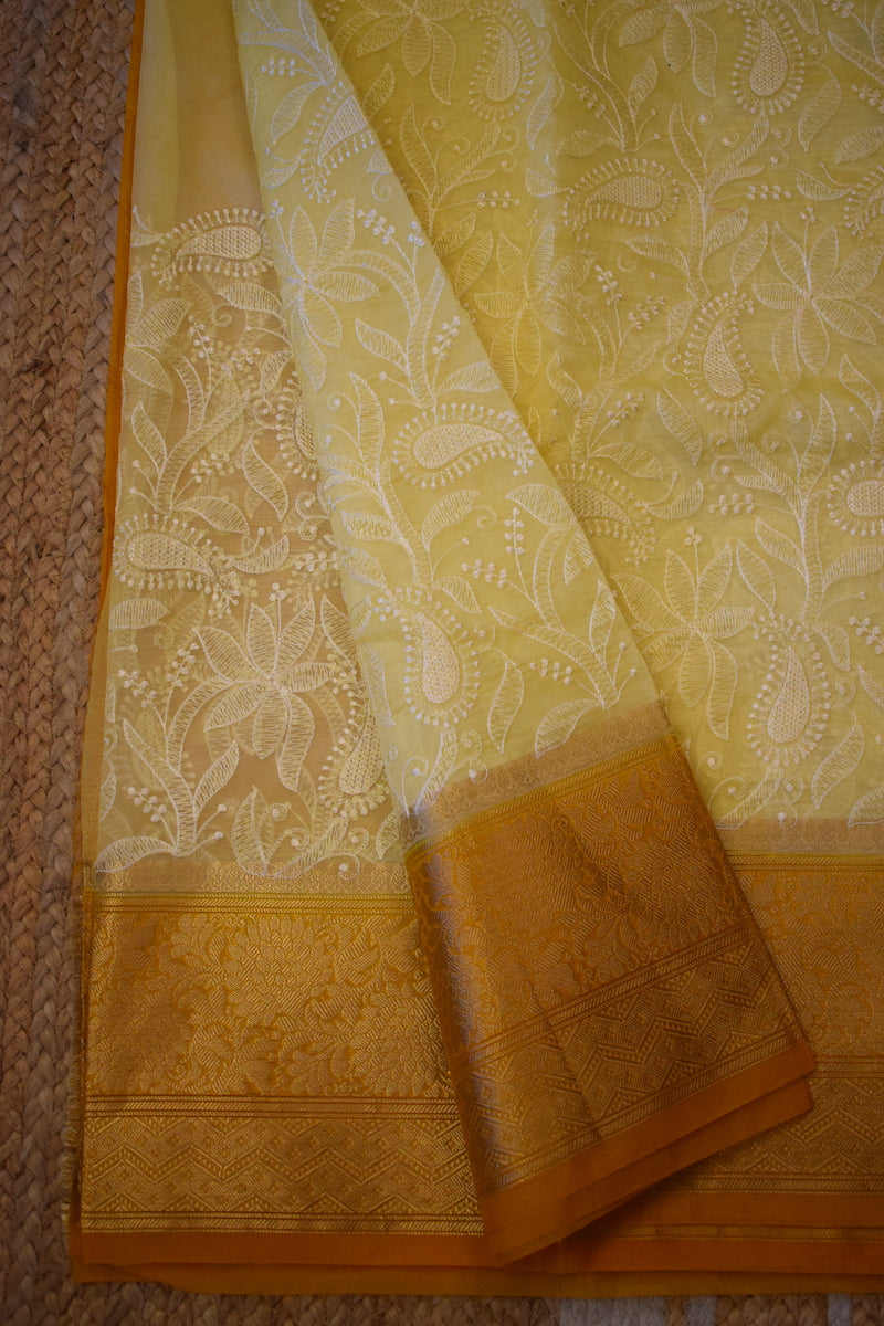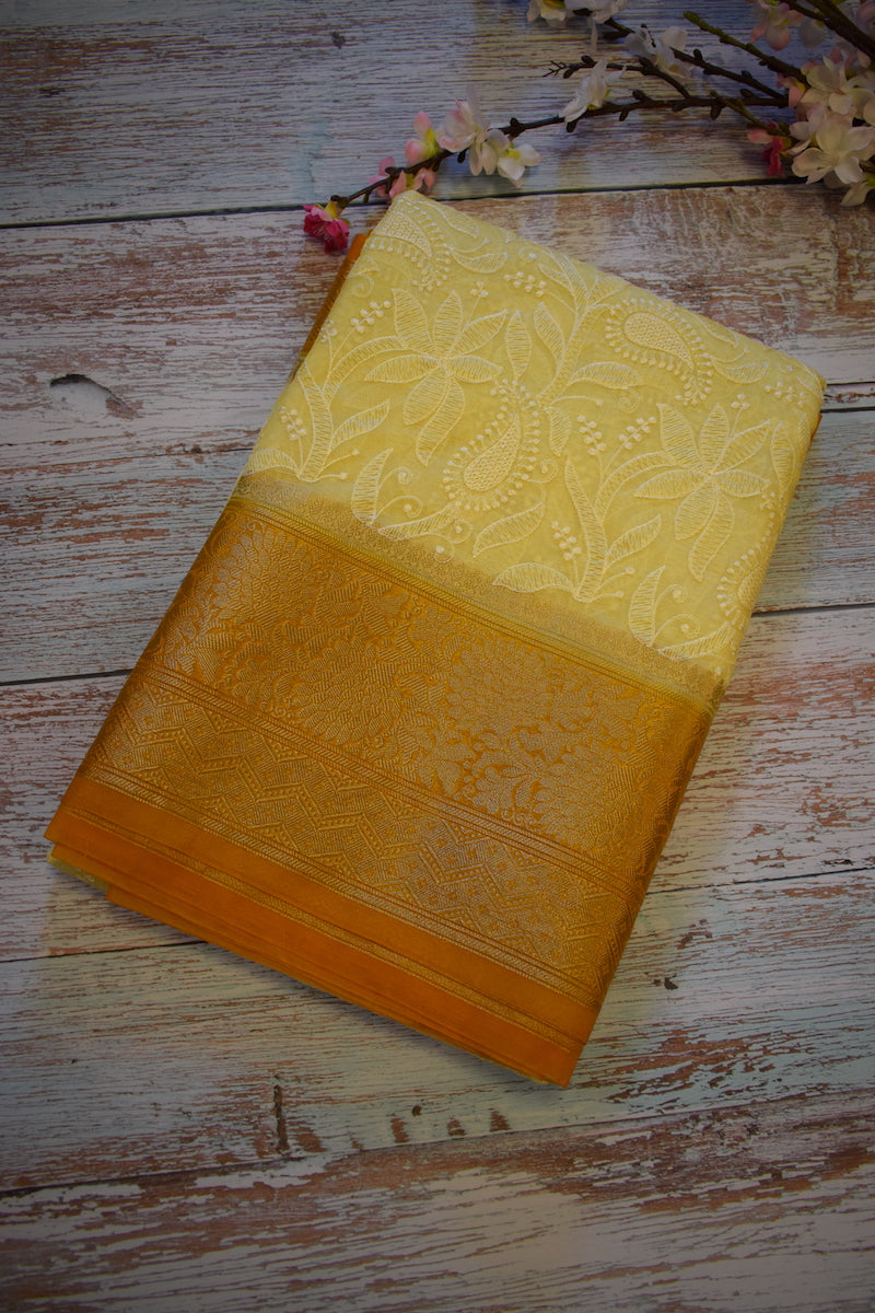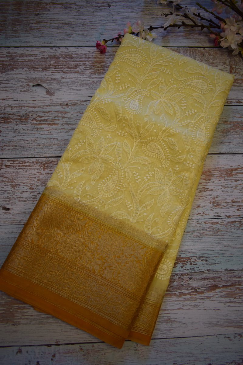 Lemon Yellow Semi Organza Chikankari Benarasi Saree