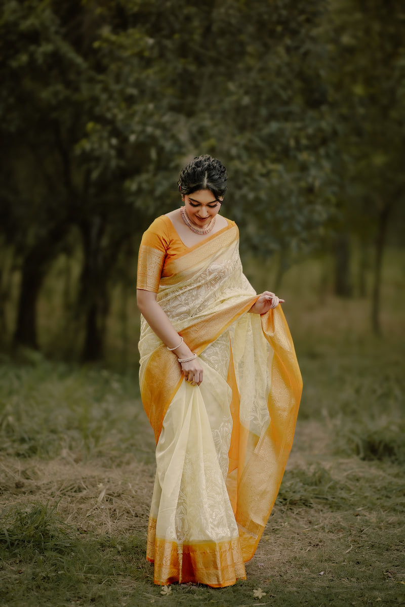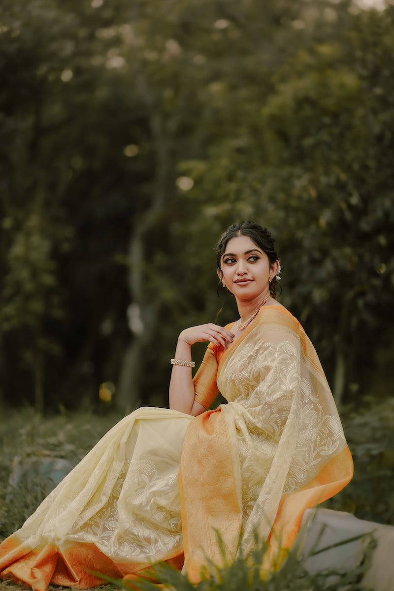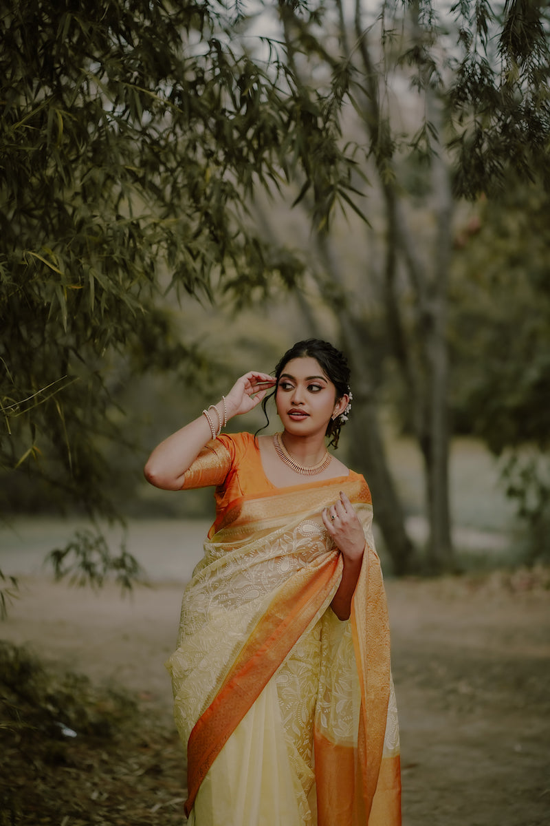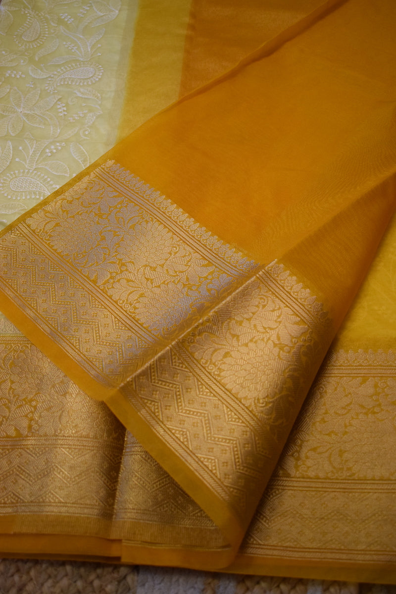 Lemon Yellow Semi Organza Chikankari Benarasi Saree