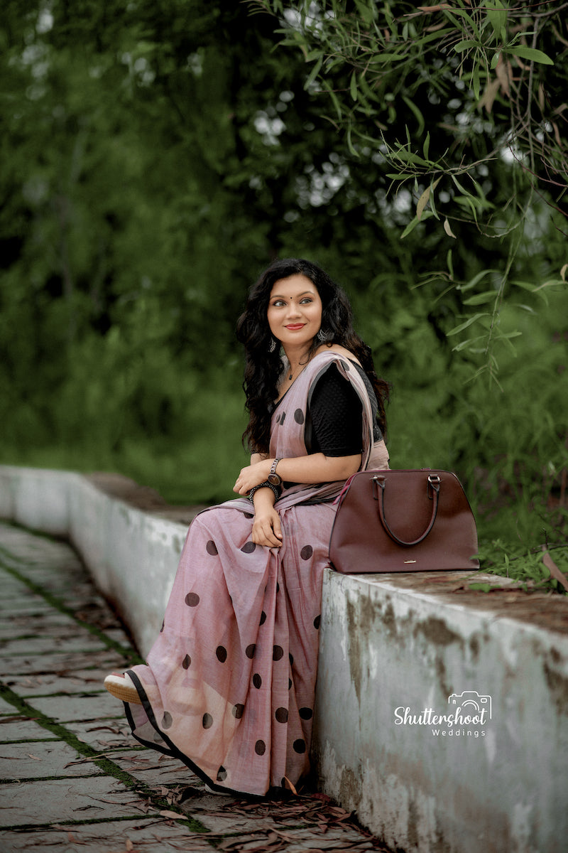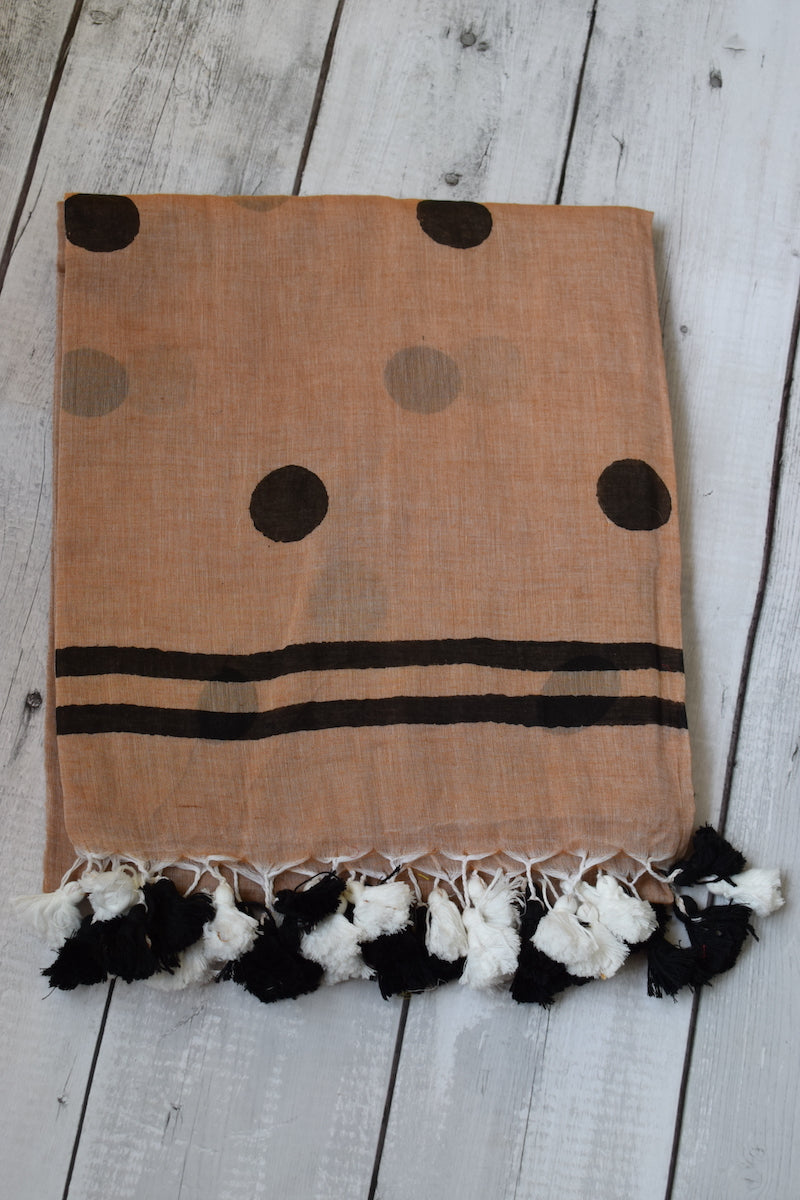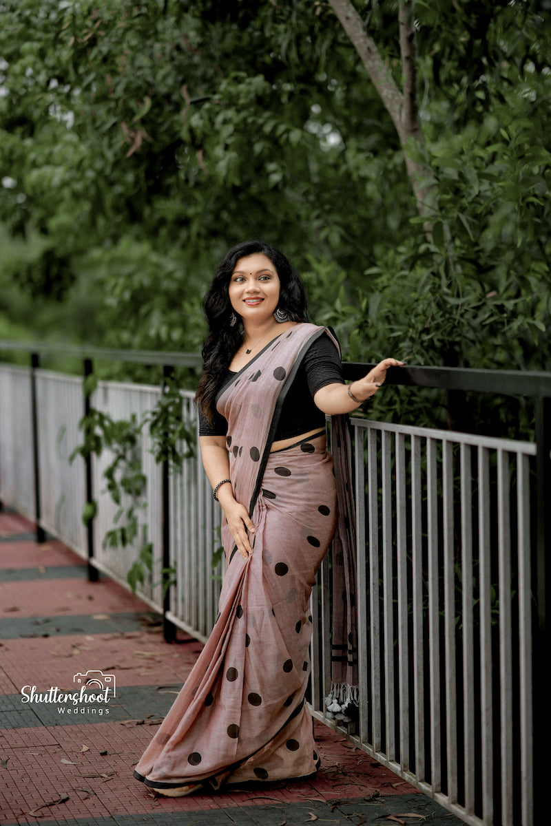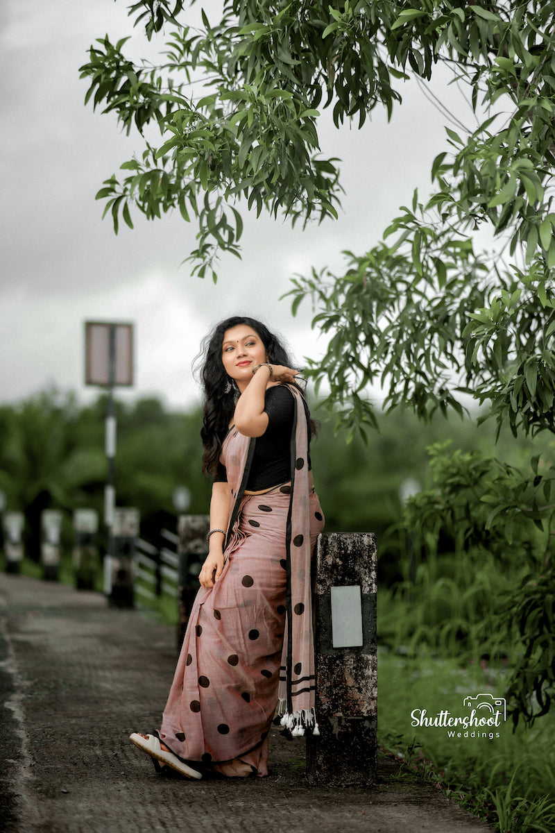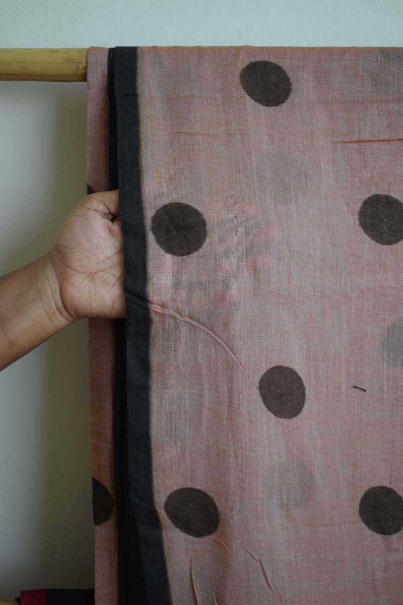 Mocha Polka Dots Mul Cotton Saree with tassels