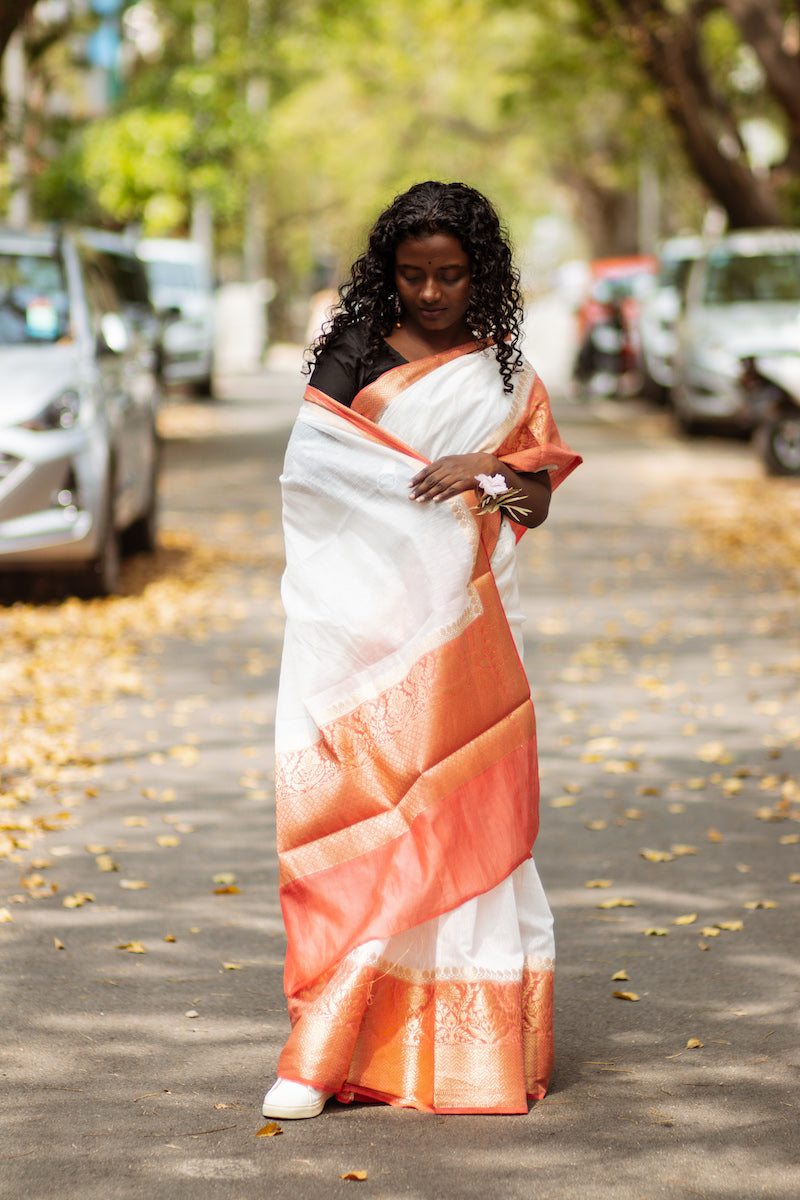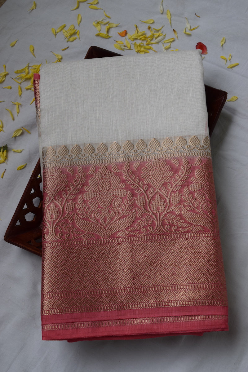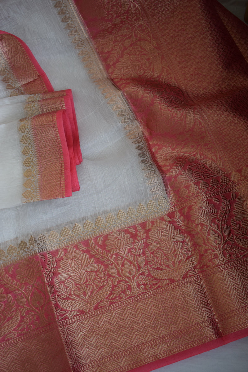 White Benarasi Linen Silk Saree