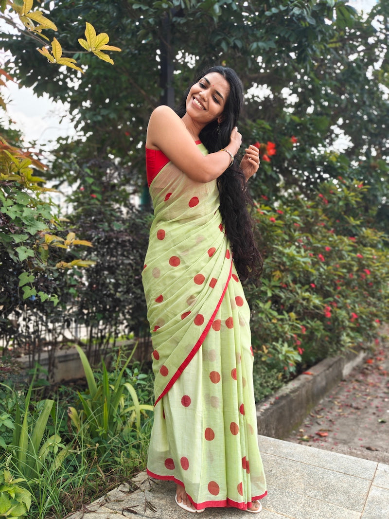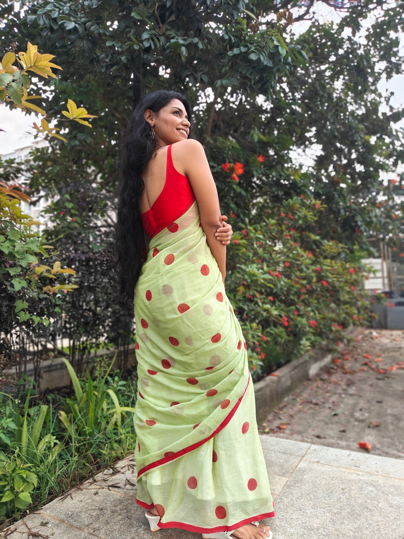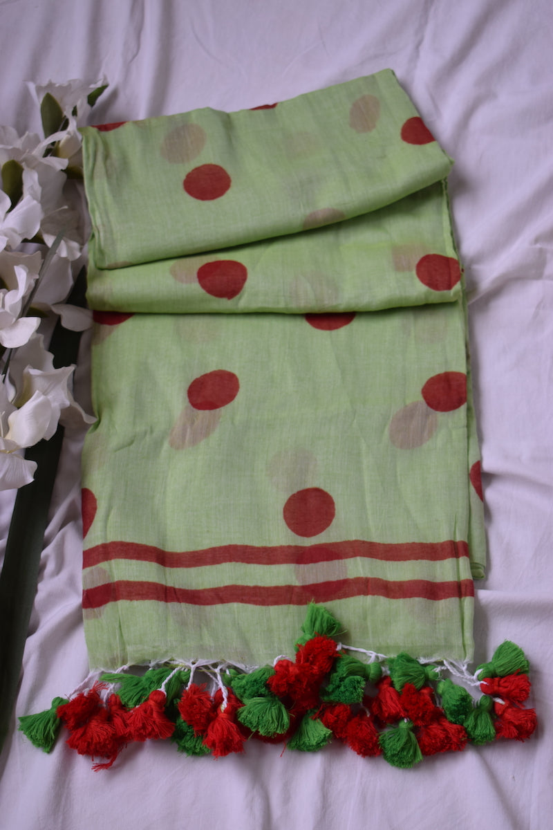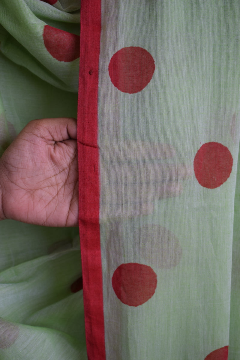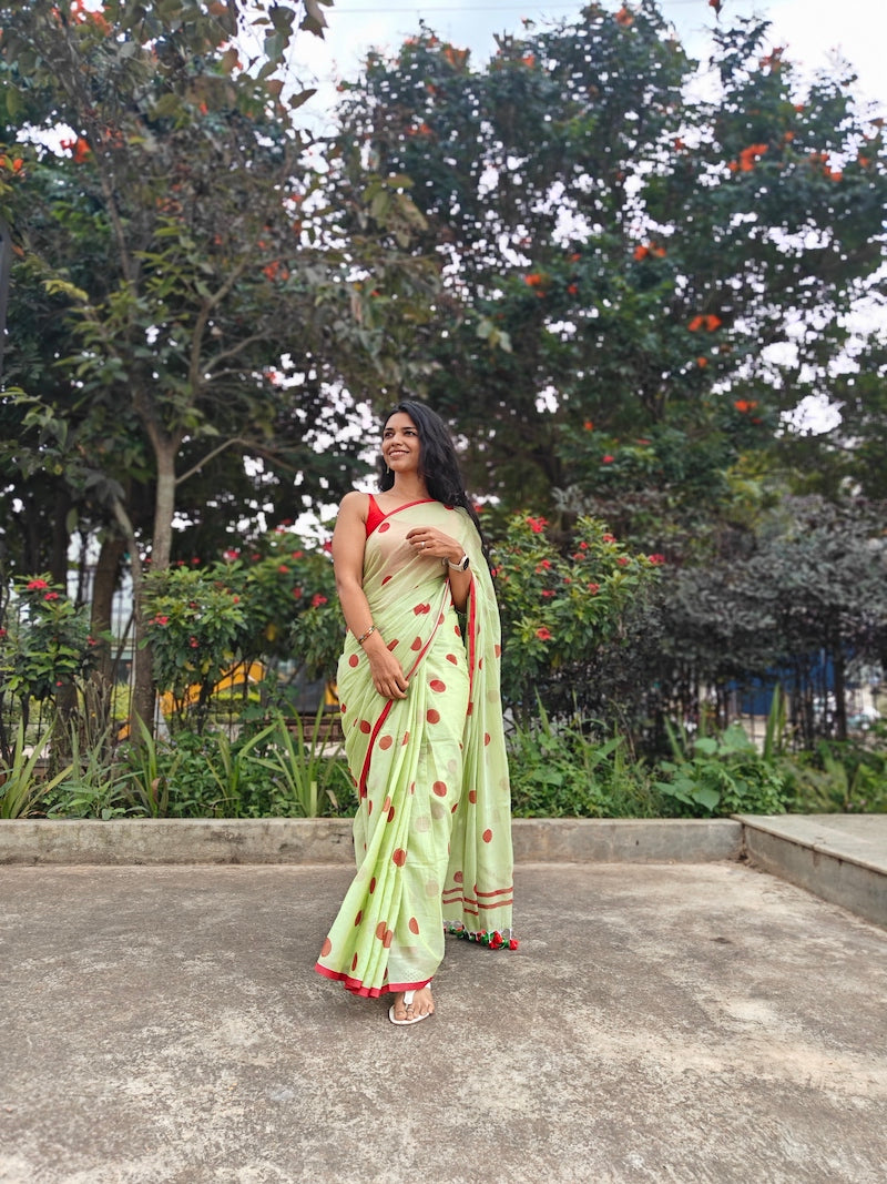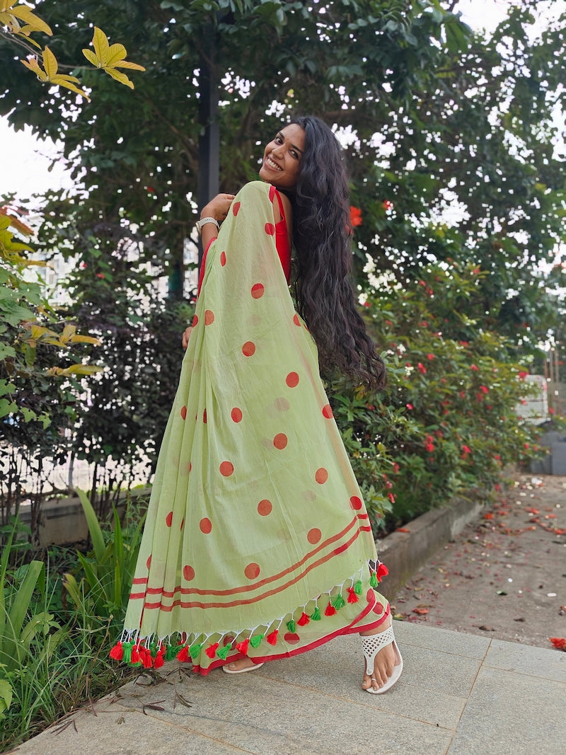 Parrot Green Polka Dots Mul Cotton Saree with tassels