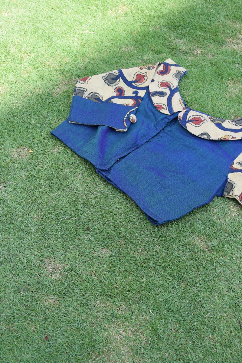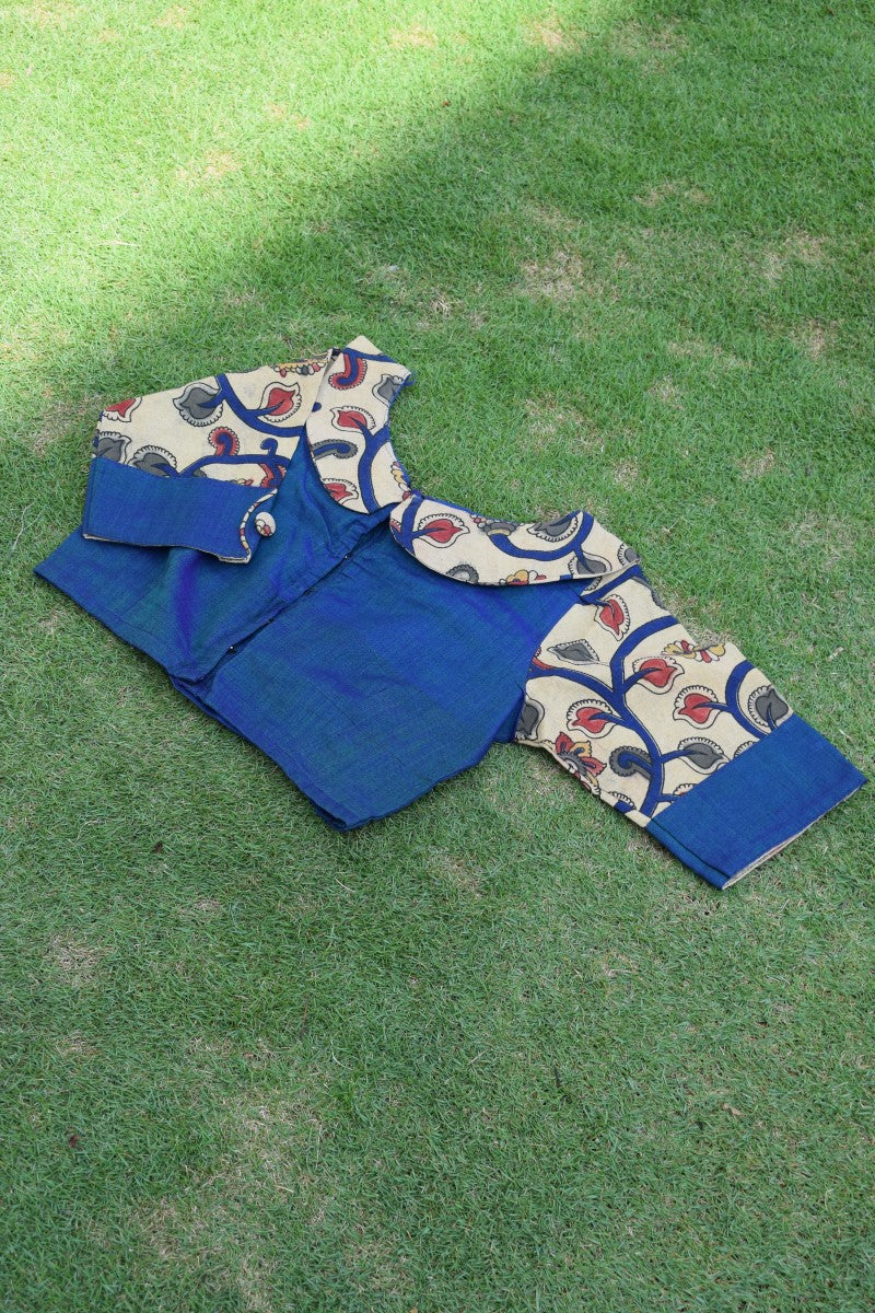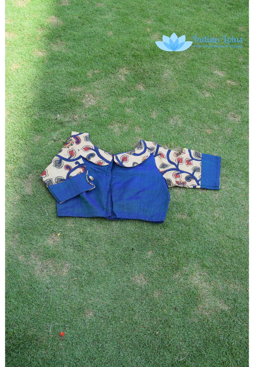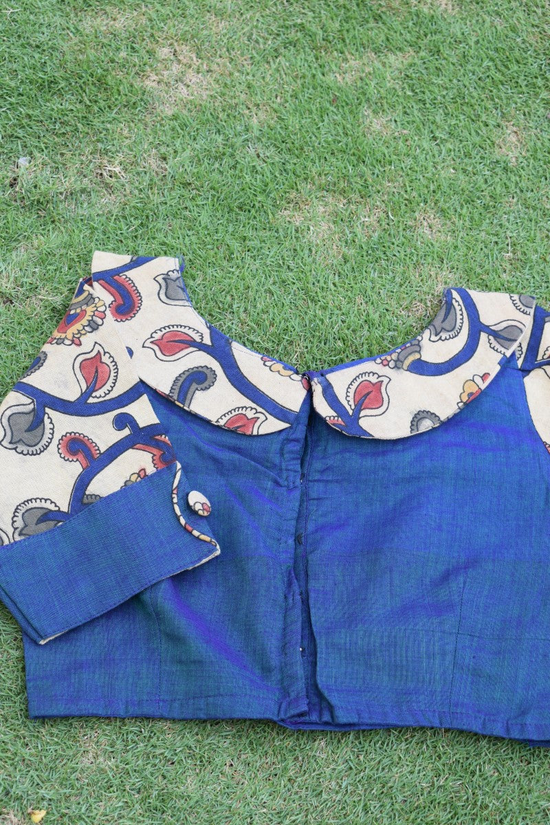 Cotton Silk blouses are breathable and hence comfortable! The Stylish peter pan neck in painted kalamkari on linen adds a retro touch to the blouse.